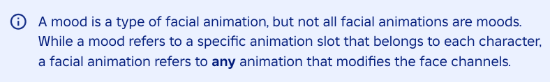 A mood is a type of facial animation for animatable heads that loops indefinitely, allowing users to express themselves and react to others with a persistent facial emotion. Moods play simultaneously with other character default animations, such as walking, climbing, and swimming, and if the default animation has a facial animation, the default animation blends with the character's mood.